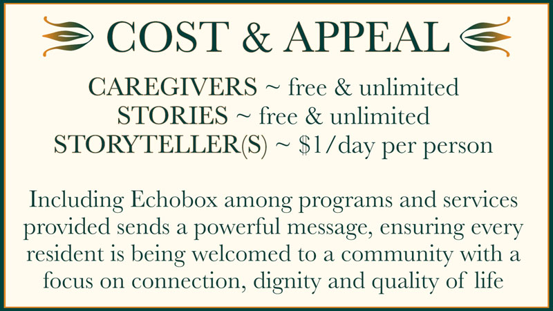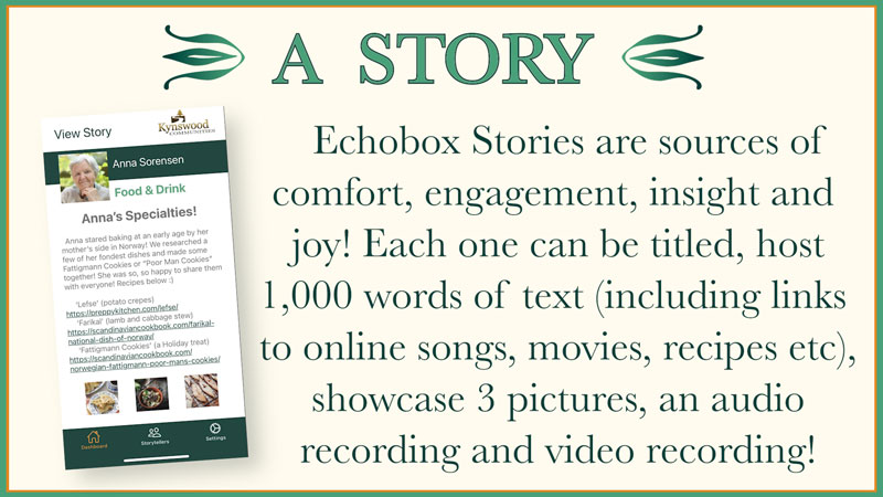 $1/day per Storyteller! That’s cheaper than a cup of coffee – and by including Echobox among the existing programs offered upon admission, this ad-free, person-centred technology can be free for services and communities to onboard. With the entire team able to access Stories, comforts and preferences entered by current and previous staff members, daily challenges can be approached with love, kindness and squarely addressed with emotional intelligence. Echobox Stories can be titled, can host 1,000 words of text (including multiple links to amazing online videos, songs and other information), can include 3 photos, a video recording and an audio recording!